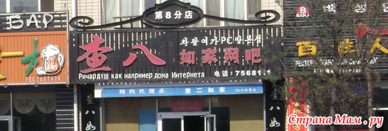 А это - образец забавной китайской рекламы. Иногда фиг поймешь, что они имели в виду. Такими вот вывесками изобилует Хунчунь, он весь ориентирован на русских. В Янцзи тоже уже русские проторили дорожку, но пока китайцы еще не готовы писать вывески на двух языках, хорошо, хоть в некоторых кафе появились меню на русском... Вообще китайцы в этом смысле будут тянуть до последнего и не начнут учить русский или переделывать вывески до тех пор, пока либо не будут уверены, что им это точно и стопроцентно окупится, либо пока им не прикажет партия... Вообще китайский менталитет - нечто особое, им многое - пофиг. К примеру, качество одежды и жилья. Куда важнее быть сытым, а на чем спать и в каких условиях - дело стотысячное. Было бы, где спать, и все...