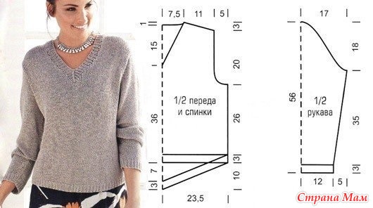 Выполнить плечевые швы. На спицы № 5 к отложенной п. V-образного выреза набрать по вырезу горловины еще 123 п. = 124 п. и вязать 3 см резинкой, распределив п. таким образом, чтобы в углублении выреза находилась 1 лиц., и выполняя в каждом круг. р. на 3 п. углубления выреза двойную протяжку (2 п. снять вместе как лиц., 1 лиц. и протянуть ее сквозь снятые п.). Петли закрыть. Втачать рукава. Выполнить боковые швы и швы рукавов.