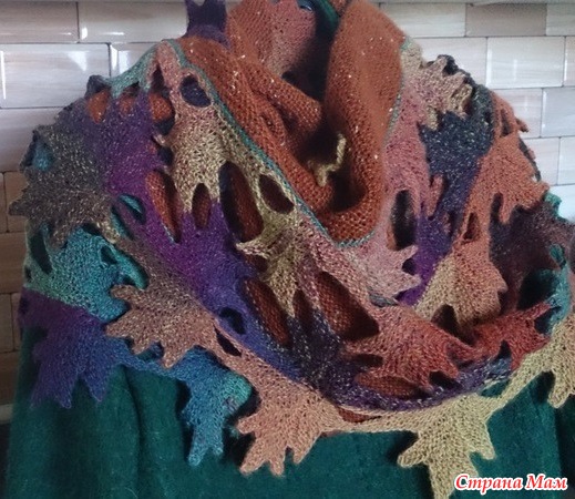 Работа получилась долгой и кропотливой, но доставила массу удовольствия. В будущем хочу связать еще такую шаль, но уже буду подбирать нитки по-другому, - так, чтобы пряжа на листиках имела более плавные переходы. Может имеет смысл попробовать здесь Кауни или Дундагу.