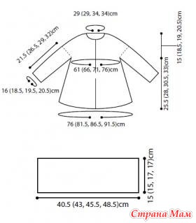 Продолжить вязание на петлях полочек и спинки, при этом в след. лиц. р. выполнить прибавления по 1 п. с каждой стороны от маркеров = 148 (160, 172, 184) п. Повторять ряд прибавлений в каждом 8 (10, 11, 12) р. еще 8 раз и на высоте 23.5 (26, 28.5, 31) см выполнить 6 рядов жемчужным узором на всех петлях и закрыть их.