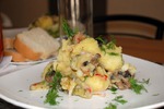 Бросаем к картошке порезанные перец, огурец, лук, обжаренные грибы. Перемешиваем, заливаем заправкой, украшаем резанным укропом и подаем. Попробовав, начинаю понимать, почему Хемингуэй очень любил это простое, незамысловатое, но от этого не менее вкусное блюдо! Совершенно необычное переплетение привычного вкуса картофеля, соленого огурца, непривычная заправка из оливкового масла и уксуса не могут никого оставить равнодушным.