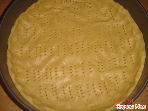 затем тесто прямо комком клади в форму и пальцами по донышку растыкай, оно скалкой не раскатывается, и в духовку, только бортик небольшой сделай, чтобы не лепешка, а сковородочка получилась, да вилкой в двух-трех местах проткни, а то вспучится