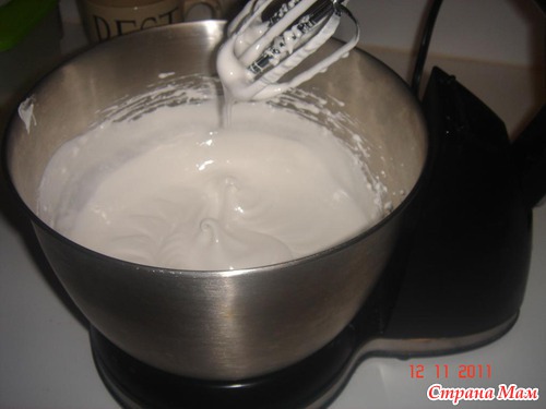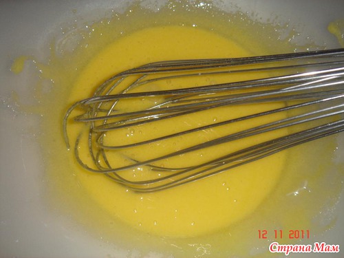 - Потом три яйца, желтки отдели от белков. Белки сунь в холодильник, а желточки взбей с двумя столовыми ложками сахара