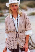 Вам потребуется: 700 (750) 800 г бежевой пряжи Mondo (52% овечьей шерсти, 48% хлопка, 120 м/50 г); крючок № 4,5; кожаная пряжка для пояса.