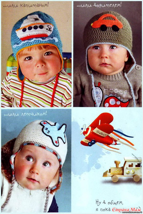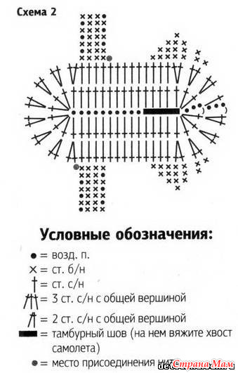 Свяжите самолетик по схеме 2. Готовую деталь самолетика обвяжите соед. столбиками и пришейте его на шапочку. Прикрепите глаза.