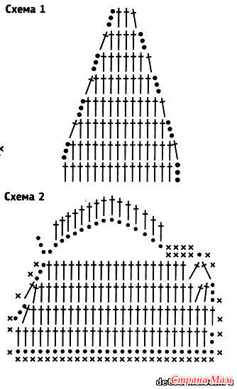 После этого оставьте для передней части 13-14 см, а на остальных петлях вяжите еще 2-3 ряда ст. с/н. Затем вяжите «ушки» по схеме 1. Обвяжите край шапочки столбиками б/н 1 рядом серой нитью и 1 рядом меланжевой нитью. Для завязок скрутите шнурки желаемой длины, пришейте к «ушкам».