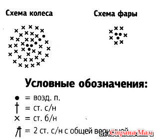 Для завязок скрутите шнурок из трех нитей, пришейте к «ушкам». Свяжите машинку, колеса и фару по схеме 2, пришейте на шапочку.