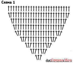 Затем оставьте для передней части 16-18 см, а на остальных петлях вяжите «ушки» по схеме 1. Обвяжите край шапочки столбиками б/н голубой нитью.