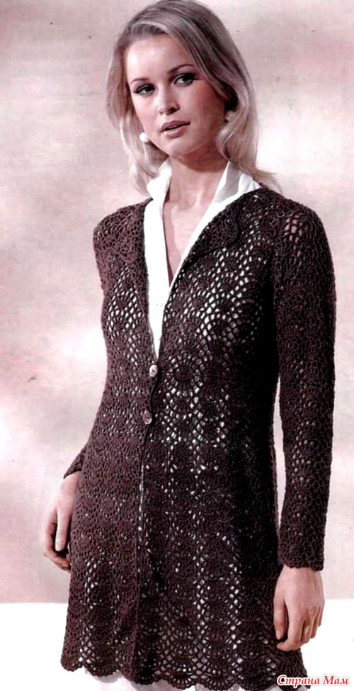 Вам потребуется: пряжа Novita Bambu (68 % бамбук, 32 % хлопок, 135 м/50 г) - 550(600)650(700)750 г темно-коричневой (№680), крючок № 3,2 пуговицы.