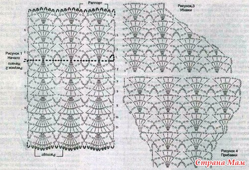 Верхняя часть рукава: нарисуйте на бумаге выкройку желаемого размера и вяжите далее с её помощью. Свяжите цепочку из 52(52)61(61)61 возд. п. (на рис. отмечено темным цветом). 1-й ряд: (рис.1) сделайте 1 ст. б/н из 8-й пет. цепочки, *2 возд. п., 2 п. пропустить и из следующей связать 5 ст. с/н, 2 возд. п., 2 п. пропустить и из следующей связать 1 ст. б/н, 5 возд. п., 2 п. пропустить и из следующей связать 1 ст. б/н*, повторить *-* еще 3(3)4(4)4 раза, 2 возд. п., 2 п. пропустить и из следующей связать 5 ст. с/н, 2 возд. п., 2 п. пропустить и из следующей -1 ст. б/н, 2 возд. п., 1 ст. с/н из последней петли. В работе 5(5)6(6)6 веер-рис. Продолжайте вязать 2-й ряд по рис. 1 и повторите по рис.1 с 1-6-й ряды. Когда повторите с 1 -6-й ряды 2 раза, прибавьте 23(24)25(26)27-м рядах с обеих сторон по 1,5(2)1,5(2)2 веер-рис. по рис 4. В работе сейчас 8(9)9(10)10 веер-рис. Когда высота детали будет равна примерно 42(43)44(45)46 см, сократите, начиная с 12(12)14(14)15-го рядов, с обеих сторон по 3(3)3,5(4)4 веер-рис. по рис.3.