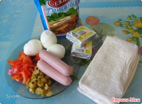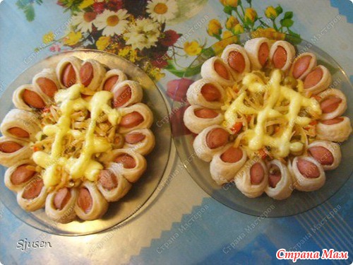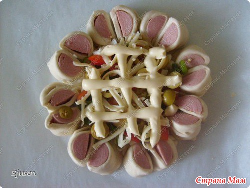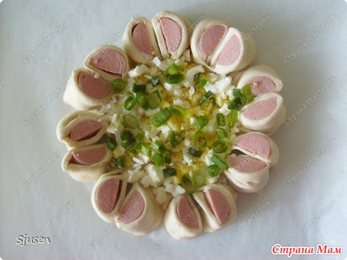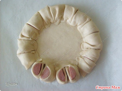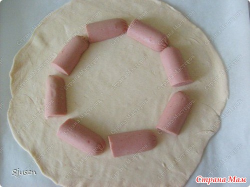 Раскатываем тесто (я беру обычное слоеное или слоено-дрожжевое) круглым пластом, сосиски разрезаем на 4 части (вдоль и пополам) и выкладываем на пласт таким вот образом: