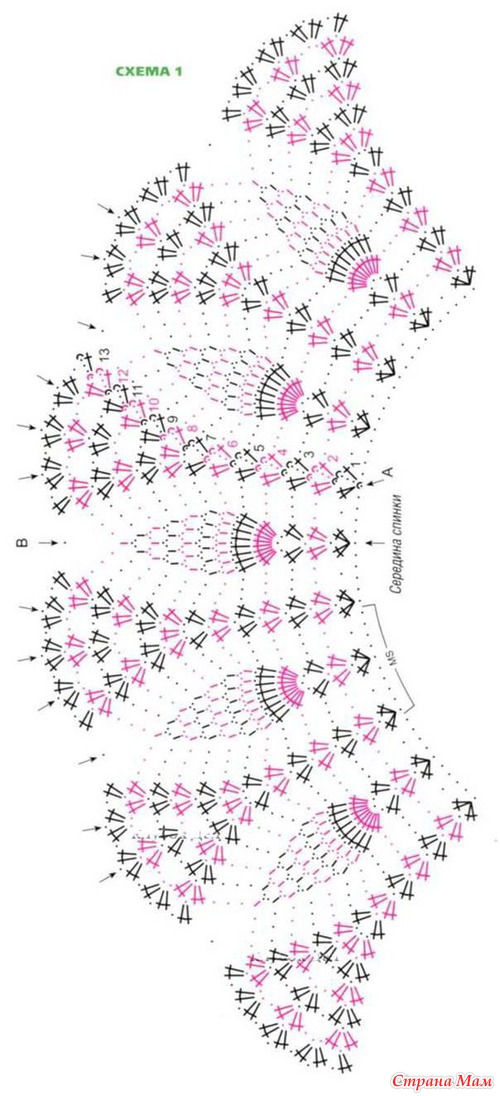 Сделать отметку и для левой проймы пропустить следующие 4 раппорта схемы 1, для переда связать на следующие 3 раппорта 13 стрелок схемы 1 по 1/2 раппорта схемы 2. Сделать отметку и пропустить для правой проймы следующие 4 раппорта, оставшиеся 1 1/2 раппорта для правой половины спинки обвязать на 6 стрелках от стрелки В левой половины спинки. Отметки обозначают боковые линии. Затем повторить ещё 12 раз 14-й и 15-й круг. р. = 39 р. от наборного края, при этом на боковых линиях (отметках) выполнить прибавления по выкройке.