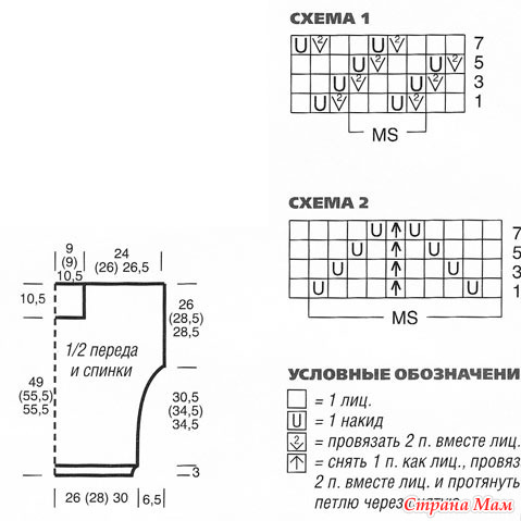 Ажурный узор: число петель кратно 4 + 1+2 кром. Вязать по схеме, на которой приведены только лиц. р., в изн. р. петли и накиды вязать изн. Начинать с 1 кром, и петель перед раппортом, повторять петли раппорта, заканчивать петлями после раппорта и 1 кром.