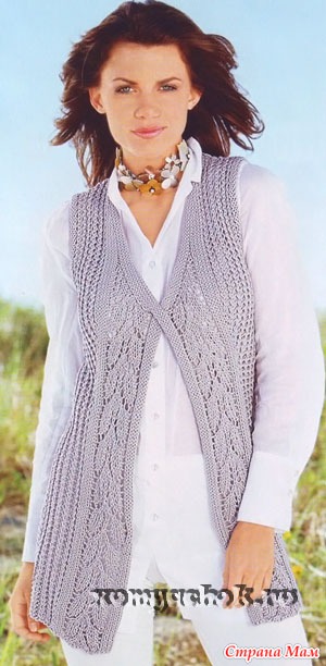 Перед с разрезом вязаного жилета. Деталь состоит из двух половин. Для левой при носке половины набрать 38 (42) 46 п. и распределить их след. образом: кром., 14 (18) 22 п. сетчатого узора. 3 п. лиц. глади, 13 п. ветки с листьями, 6 п. лиц. глади, кром. Последние 6 п. лиц. глади + 1 кром, в дальнейшем будут обозначены как п. планки. Боковой скос с правого края работы выполнить как для спинки.