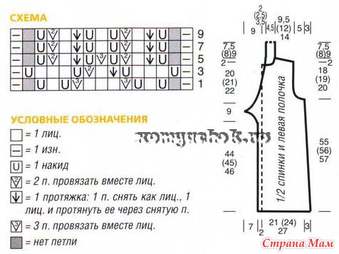 Через 44 (45) 46 см от наборного края вывязать из поперечной нити между сетчатым узором и дорожкой из лиц. глади 1 лиц. скрещ. и далее вязать по рисунку сетчатым узором. Такие прибавления выполнить еще 8 раз в каждом 2-м р. = 43 (47) 51 п.