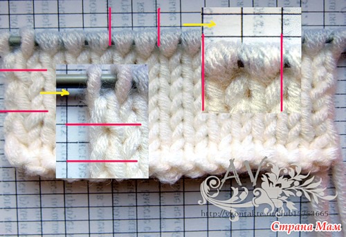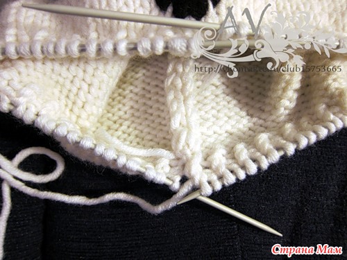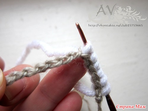 Цепочка состоит из двух сторон: на одной стороне она выглядит как цепочка лицевых петель, на другой – как цепочка из горизонтального ряда изнаночных. В ушки этих изнаночных петель с помощью крючка набираем основной нитью 78 петель и переносим их на спицы. После окончания работы, можно легко распустить цепочку воздушных петель и иметь петли для надвязывания резинки эластичной по краю и нужной ширины!