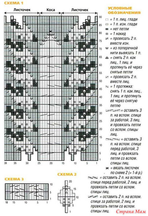 Узор с косами: число петель кратно 8 + 2 п. Вязать по схеме 3. Выполнить 1 раз с 1-го по 6-й р... затем повторять с 3-го по 6-й.
