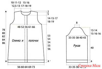 Спинка: набрать 84/90/96/104/110 п. и связать 4 см = 10 р. жемчужным узором. Затем вязать следующим образом: 9/11/13/16/18 п. изн. глади. 27 п. основного узора. 12/14/16/18/20 п. изн. глади. 27 п. основного узора. 9/11/13/16/18 п. изн. глади. Через 14 см = 30 р. от наборного края убавить для боковых скосов с обеих сторон на расстоянии 2 п. от края в каждом 16-м р. 5 х 1 п. Через 110 р. от наборного края вязать изн. гладью на оставшихся 74/80/86/94/100 п. Через 57/58/58/59/60 см = 116/118/118/120/122 р. от наборного края закрыть для пройм с обеих сторон в каждом 2-м р. 1 х 3 п., 2 х 2 п., 2 х 1 п./1 х 3 п., 2 х 2 п., 3 х 1 п./1 х 3 п., 2 х 2 п., 4 х 1 п./2 х 3 п., 2 х 2 п., 4 х 1 п./2 х 3 п., 3 х 2 п., 3 х 1 п. В последнем ряду убавлений равномерно прибавить 28/30/32/38/38 п. = 84/90/96/104/108 п. Далее вязать узором с косами, начиная с 7 изн. вместо 2 изн./2 изн./5 изн. вместо 2 изн./1 изн. вместо 2 изн./З изн. вместо 2 изн. Через 19/20/22/23/24 см от начала проймы закрыть для скосов плеча с обеих сторон в каждом 2-м р. 3 х 8 п./1 х 8 п., 2 х 9 п./2 х 9 п., 1 х 10 п./2 х 10 п., 1 х 11 п./1 х 10 п., 2 x 11 п. Одновременно с 1-м убавлением для скоса плеча закрыть для выреза горловины средние 32/34/36/38/40 п. и обе стороны закончить раздельно. Для закругления закрыть с внутреннего края 1 х 2 п. Через 21/22/24/25/26 см от начала проймы все петли должны быть закрыты.