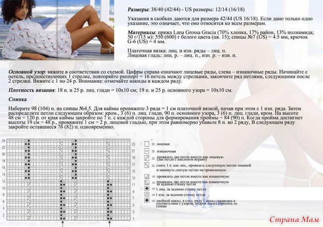 Ажурная туника, выполненная спицами из белой хлопковой пряжи, станет отличным дополнением к любому гардеробу. Ее можно комбинировать с летними легкими брюками, леггинсами, а также с пляжными вещами.