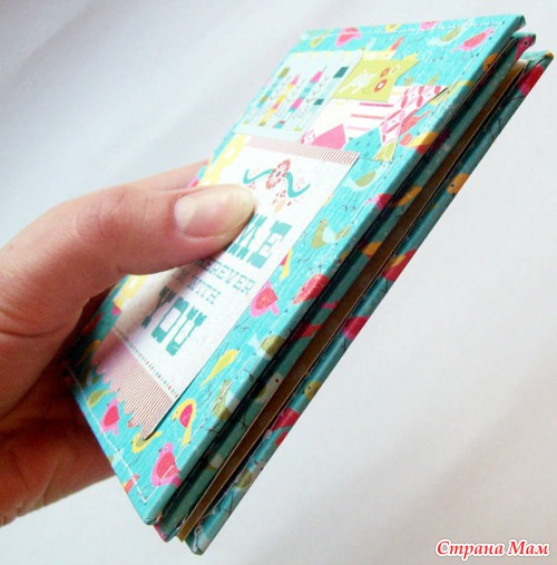Теперь оборачиваем картон в подготовленные детали бумаги самого большого размера (13х14 см). Для этого наклеиваем двусторонний скотч, оставляя края свободными (если вы будете прошивать).