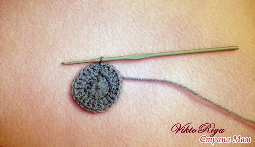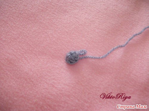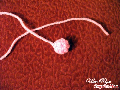 Приступаем к носу. Нос-это простая "пимпочка" Набираем 3 ВП, замыкаем в круг и обвязываем 8 столбиками с накидом. Второй ряд без прибавлений провязываем столбиками без накида. Оставляем ниточку для пришивания