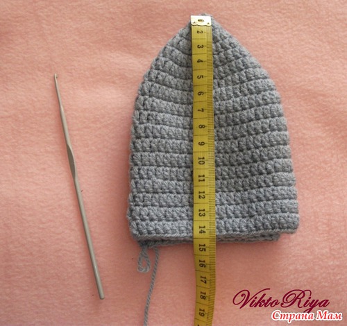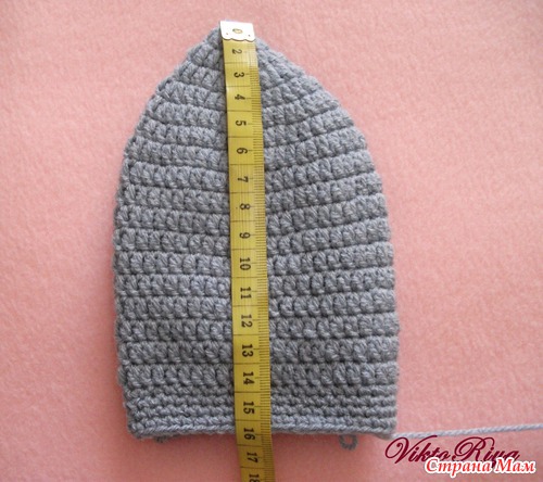 Высота шапочки в моем случае должна быть 16,5 см. Вяжу столбиками с накидом 14 см, чтобы еще 2,5 см провязать столбиками без накида. Шапочка не так от этого растягивается.