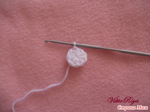 Набираем 3 ВП, замыкаем в круг и обвязываем 6 столбиками с накидом. Получается вот такая "пумпочка"