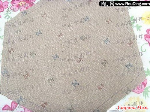 Затем прошиваем центральные точки каждой стороны шестиугольника, так чтобы цветная ткань оказалась внутри.