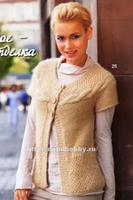 Вам потребуется: 450 (500) 550 г бежевой пряжи Tr umerei (65% овечьей шерсти, 35% полиамида, 80 м/50 г); круговые спицы № 6 и № 7; 3 деревянные пуговицы.