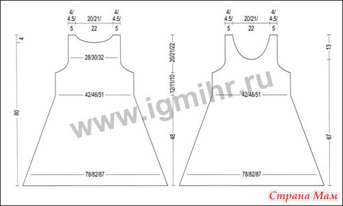 Перед. Вязать, как спинку. Проймы выполнить на высоте пройм спинки. Для оформления горловины через 67 см от начального ряда закрыть ступенчато (последнюю петлю ряда не провязывать. Работу повернуть, снять 1-ю петлю левой спицы и непровязанную петлю предыдущего ряда протянуть через снятую петлю. Далее петли закрыть обычным способом) средние 26/34/42 п. и с обеих сторон в каждом 2-м р. закрыть еще 1 х 5 п., 1 х 3 п., 1 х 2 п. и убавить 4 х 1 п., затем еще убавить в каждом 4-м ряду 3 х 1 п. Плечи выполнить так же, как на спинке, и на такой же высоте.