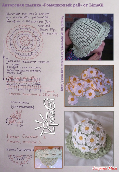 Я вязала из пряжи Бегония(169м\50 гр), в одну нитку. На всю шляпку и ромашки ушло чуть больше одного моточка на размер 42-43 см.