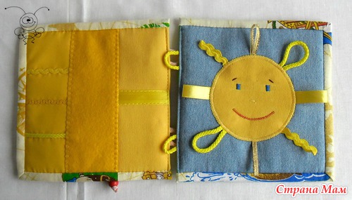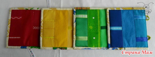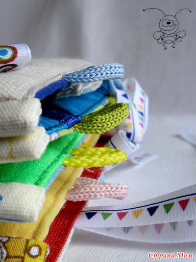 Петельки сделаны из разноцветных шнурочков. На репсовой ленте, скрепляющей странички, изображены флажки четырех основных цветов.