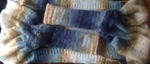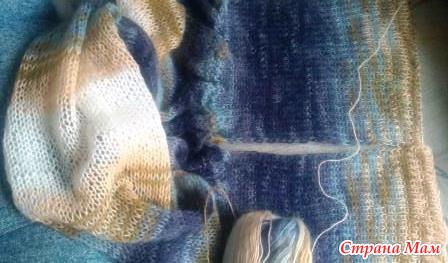 С рисунком не мудрила, чтобы не перегружать качество и расцветку пряжи: чулочным вязанием - основное полотно, а по краю пустила платочную вязку. Единственное: с практической точки зрения подобрала темную расцветку секций пряжи, одинаковую для обоих рукавов