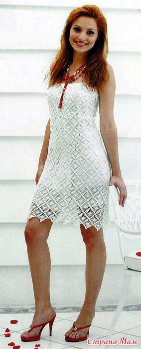 Бретели: сделать 4 цепочки из в.п. длиной 28 см каждая. После этого приколоть, присоединить столбиком по 2 на каждой стороне платья.