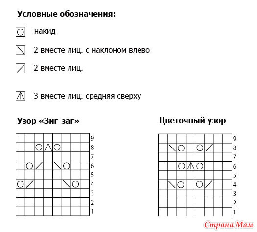 Ряд 8: * 3 лиц., накид, 3 вместе лиц. средняя сверху, накид, 2 лиц.; повторять от * до конца ряда.
