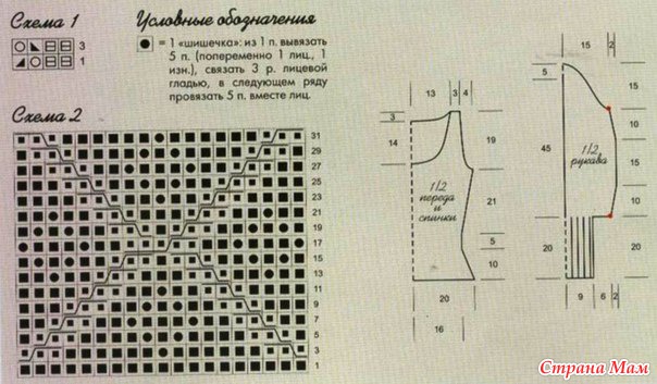 Основной узор: вязать лицевой гладью, выполнив в центре мотив по схеме 2. В изн. р. петли вязать по рисунку.