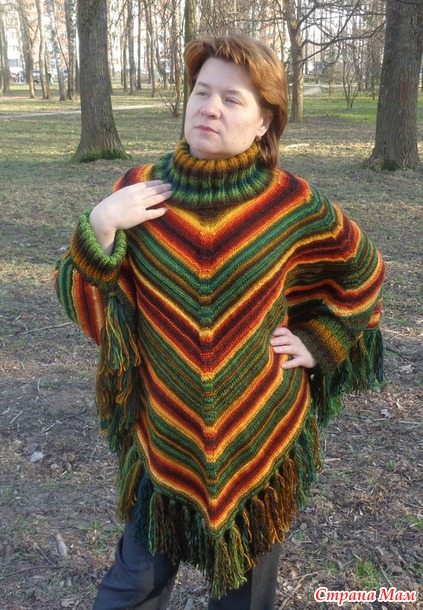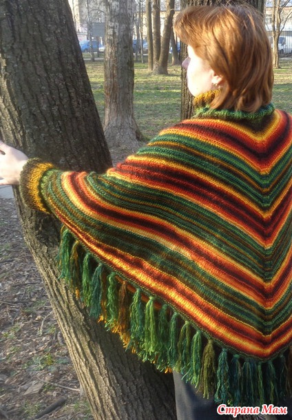 "Очень удобное пончо с бахромой вяжется целиком сверху вниз, а меланжевые полоски на нем получаются благодаря пряже секционного крашения.