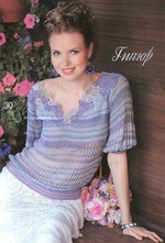 Спинку вяжите прежним узором, полочку продолжите по схеме 30 з. Связав блузку нужной длины, выполните пояс СБН шириной 5,5 см. Затем выполните рукава блузки узором по схеме 30 с манжетами шириной 5,5 см СБН. Ажурные мотивы кокетки расшейте бисером.
