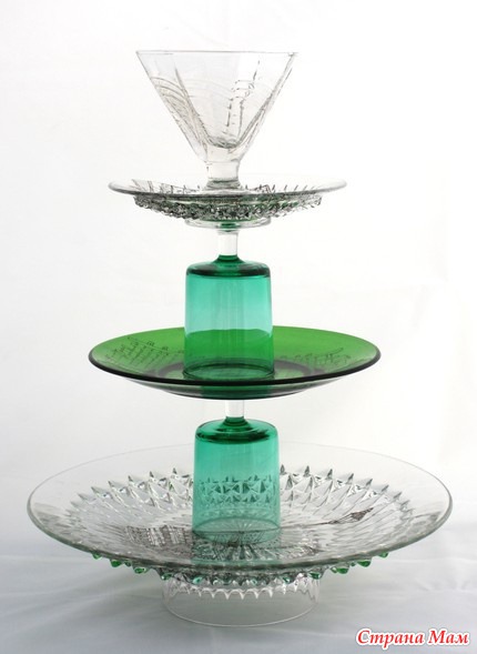 А если взять и соединить несколько тарелочек подсвечниками или пластиковыми одноразовыми бокалами - выйдет замечательная этажерка для фруктов!