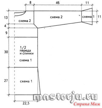 Выполните плечевые швы. По пройме наберите 72 п., вяжите узором 2, прибавляя с обеих сторон в каждом ряду 12 раз х 1 п. Затем для скосов рукава убавляйте по 1 п. с обеих сторон в каждом 8-м ряду. На высоте 46 см увеличьте количество петель в 2 раза с помощью накидов и вяжите 11 см узором 1.