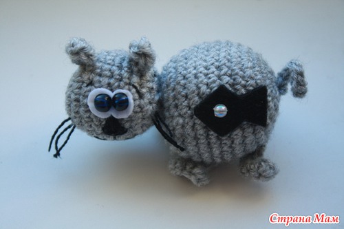 Сборка: Кот получается достаточно мелким, поэтому для сшивания лучше использовать крепкую катушечную нить, а не нить из пряжи. Оформляем мордочку. Пришить ушки. Черным ирисом вышить носик и ротик. Пришить белки глаз. Пришиваем глаза бусины или бисеринки, при желании вышиваем брови. Пришиваем голову к телу. Пришиваем ножки и хвостик. Усы можно сделать из лески, проволоки или из черной нити, натертой воском. Приклейте к телу любую аппликацию. Если пряжа светлая, можно затонировать игрушку тенями (например, сделать полосы). Котик готов!
