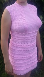 Вязать платье начала отрезное под грудью вверх. Вязала сразу поворотными рядами, чтобы рисунок был одинаковый после разделения полотна на перед и спинку.