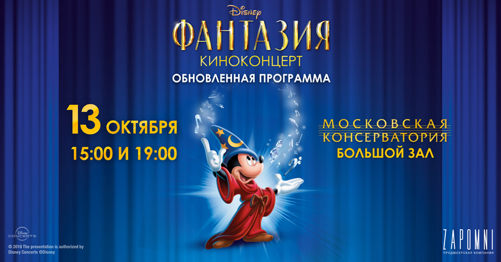 Билеты на киноконцерт «Фантазия» можно приобрести на сайте fantasiaconcert.disney.ru, а также у билетных операторов. Концерт создан в сотрудничестве с продюсерской компанией «Zapomni».