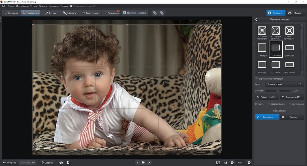 2. В разделе «Инструменты» разверните вкладку «Обрезка и поворот». Выберите один из шаблонов с заданным соотношением сторон или кадрируйте по собственным пропорциям.