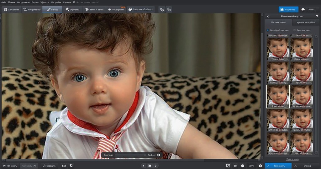 5. Чтобы добавить резкость на глаза, откройте вкладку «Идеальный портрет» и выберите фильтр «Ясный взгляд». С помощью нейросетевых алгоритмов вы также можете изменить форму улыбки, сделать зубы белее, убрать жирный блеск и покраснения кожи. Если вы фотографировали ребенка вместе с родителями, можно улучшить внешность мамы и папы с помощью «Общих улучшений» или даже «Эффектного портрета», но для детей такие фильтры не нужны — их кожа без того свежая и чистая.