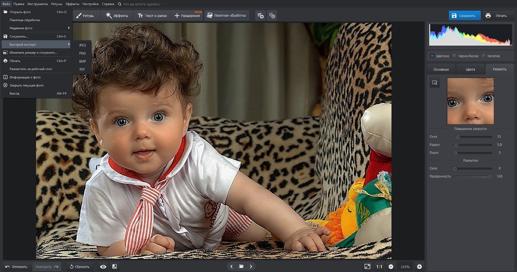 7. Сохраните фото в удобном формате. Вы также можете сразу изменить размер, чтобы опубликовать снимок в соцсетях или сразу отправить изображение на принтер.