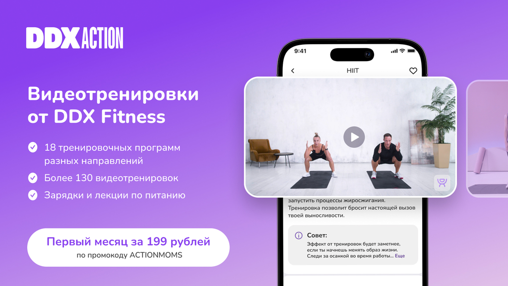 Если вы не знаете, с чего начать и как правильно выполнять упражнения, выручат видеотренировки DDX Action. Каждая программа здесь составлена опытным тренером, который объясняет, как делать упражнения, показывает их все, включая разминку и заминку. Остается только включить приложение в удобное время и повторять за инструктором. Фитнес для мам онлайн мотивирует заниматься регулярно и с удовольствием. А с промокодом ACTIONMOMS первый месяц будет стоить всего 199 рублей.