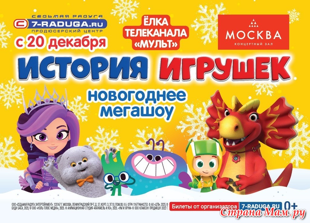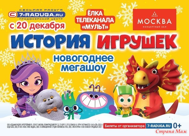 C 20 по 21 декабря, с 24 по 30 декабря 2025 года и со 2 по 7 января 2026 года в ультрасовременном концертном зале «Москва» на территории парка «Остров Мечты» состоится премьера феерического новогоднего мегашоу «История игрушек» от продюсерского центра «Седьмая Радуга».