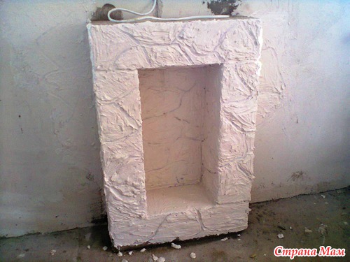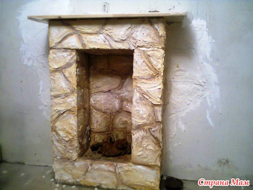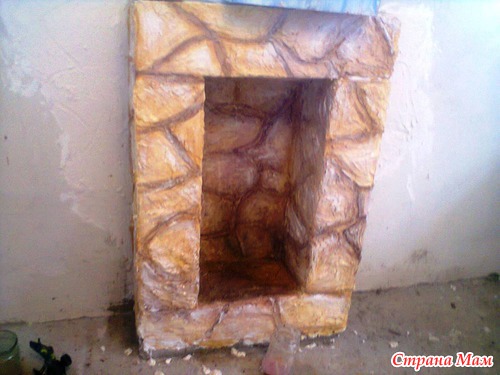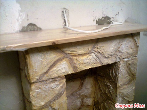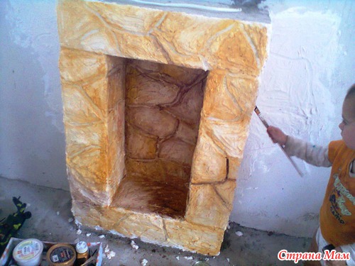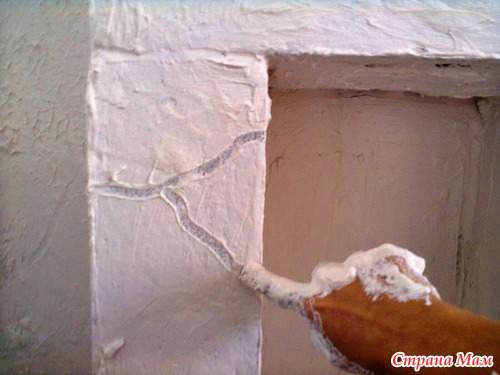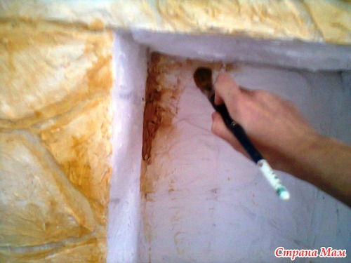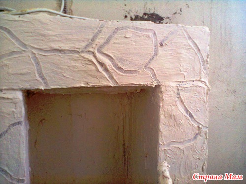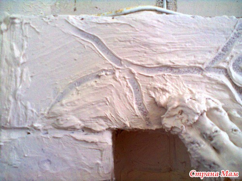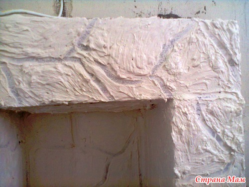 Таким образом, покрываем шпаклевкой всю конструкцию. Далее, пальцем, черенком кисточки или рукояткой ножа, пока не высохла шпатлевка, наносим "швы" наших будущих камешков.