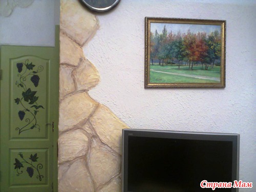 Тему камешков мы продолжили в проеме напротив камина (диктуется такое решение практичностью - белая краска очень быстро в нашей семейке потеряет "белизну"), ремонт не закончен, но покажу "кусочек":